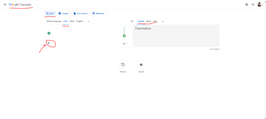 Now I will select my language, like Urdu, and in which I want to translate, I will select English. Then I will just keep speaking, and whatever I say will be written in English, professionally and with perfect grammar.