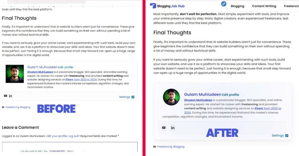I asked ChatGPT to give me custom CSS code that would give the author box a premium look. They provided me with custom CSS code. Then I went into my WordPress website’s customizer and added the code to the custom CSS section. After that, my website’s author box looked quite premium and professional.