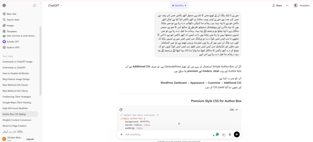 A few days ago, I wanted to improve my website’s design. I told ChatGPT which WordPress theme I was using and that I needed to improve my website’s author box because it looked too generic.
