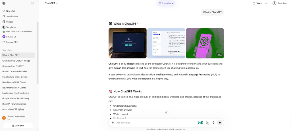 ChatGPT is a completely different category of AI writing assistant. Developed by OpenAI, it’s a large language model that can generate human-like text based on your prompts. Unlike Grammarly, which only corrects existing text, ChatGPT can also create new content from scratch.