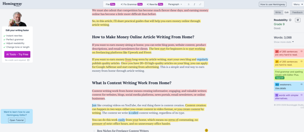 The most important thing I want to mention here is that Hemingway tells you which sentences are complex. It does highlight them, but you have to buy the Plus version. You can also fix grammar and read them, but you need to have a plan for that.