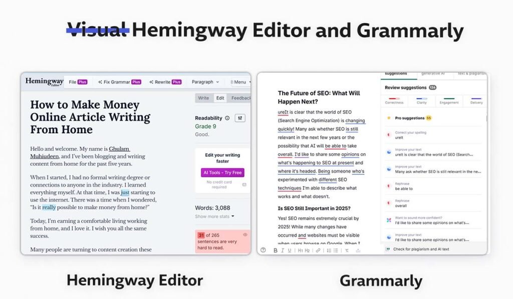 Grammarly makes sure your writing is correct. Hemingway makes sure your writing is clear. You need both to produce content that is actually good — content that ranks, keeps readers engaged, and builds your reputation as a trusted voice in your niche.